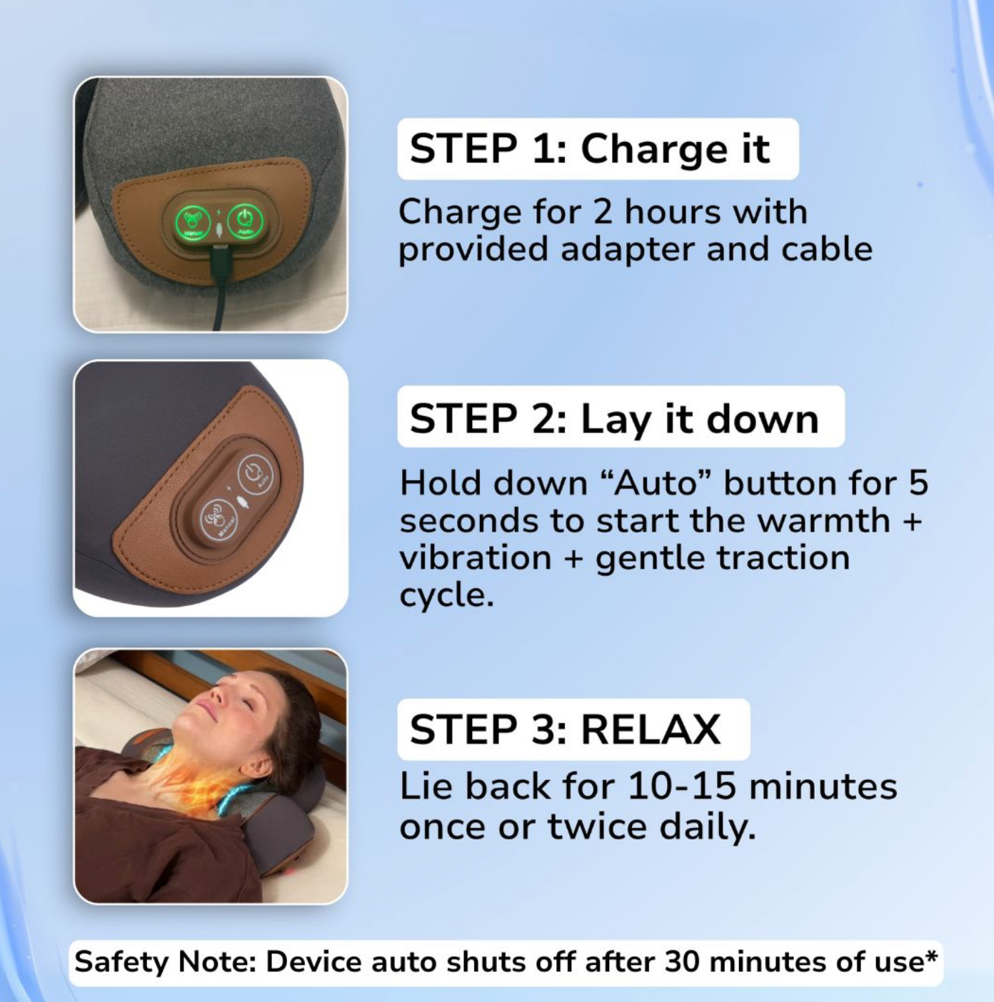This helps release trapped nerves and relieves pressure from herniated discs, leaving you with a healthy neck—and a smile—forever.
